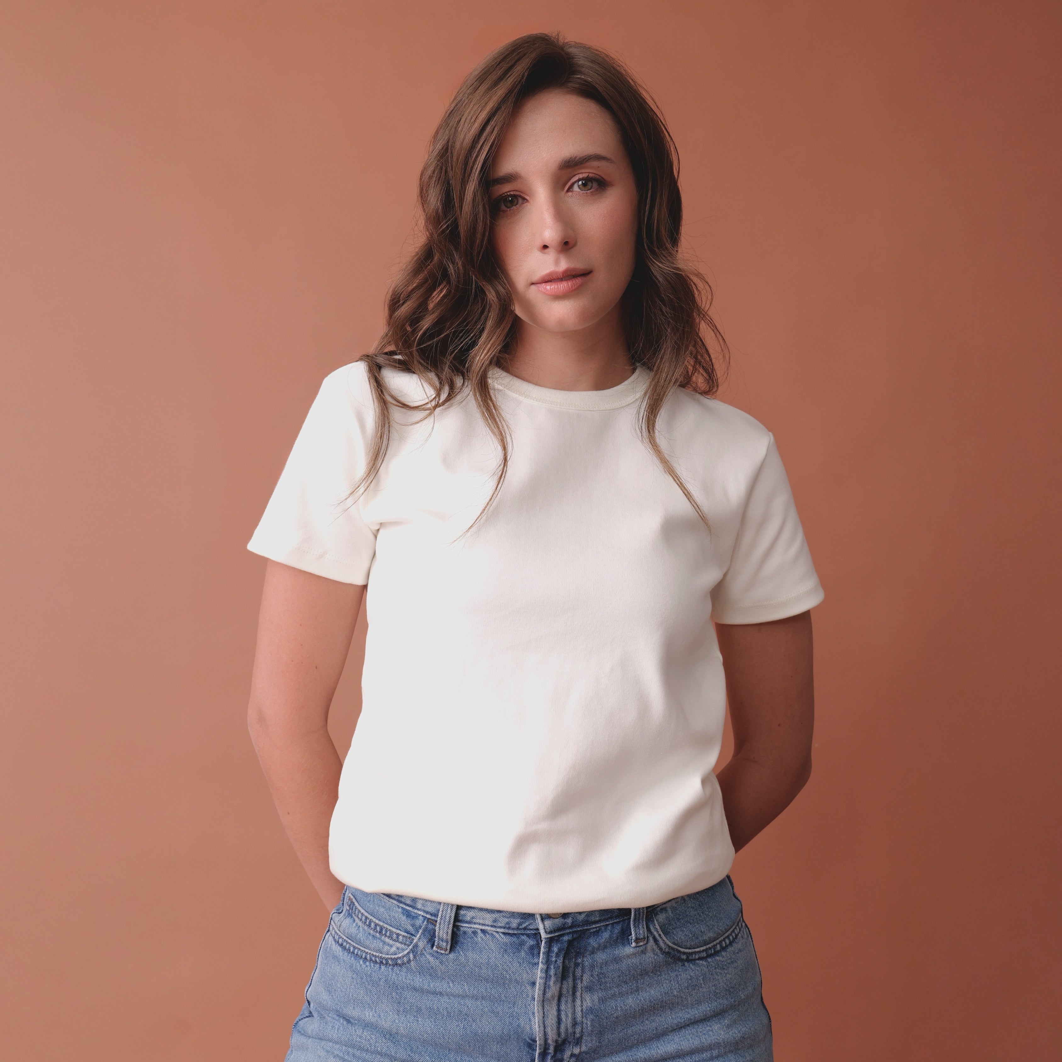 Camiseta básica para mujer regular fit color marfil, 100% algodón suave de 340 gramos con corte clásico. Una prenda clave y esencial para cualquier armario.